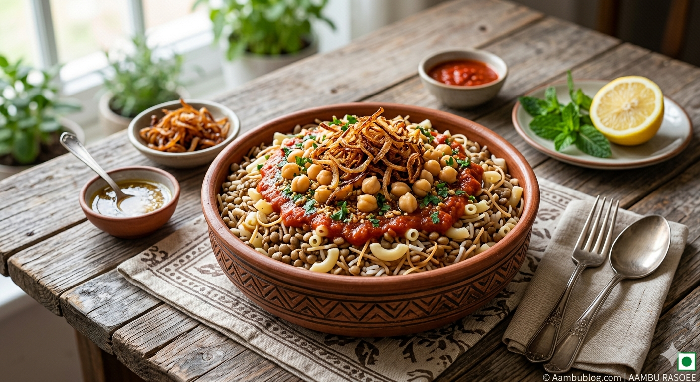 - Assembly (The Traditional Way): To serve, start with a layer of the rice/vermicelli mix, then a layer of lentils, and finally a layer of pasta.