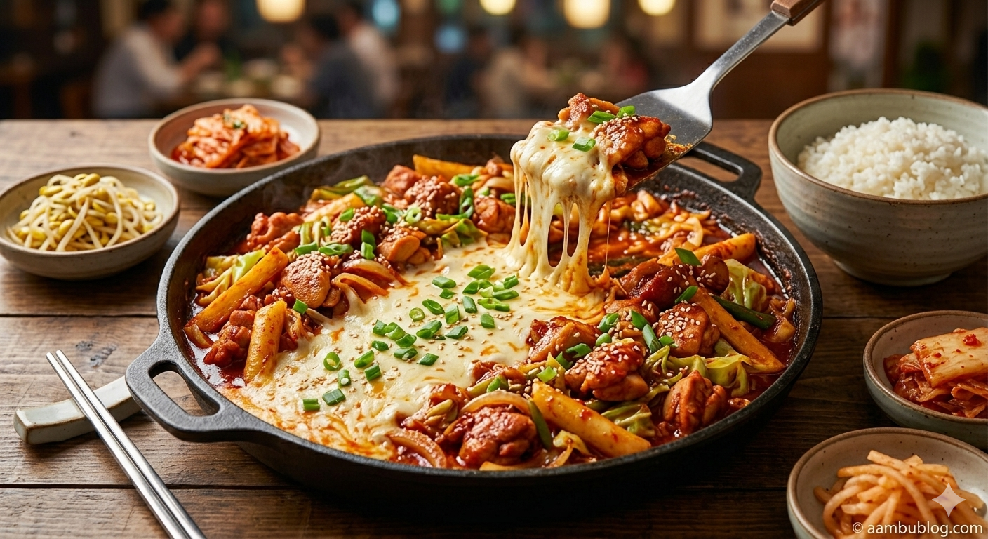 Welcome to South Korea! If there is one dish that has taken the internet and street food scenes by storm, it is Cheese Dakgalbi. This highly addictive dish consists of bite-sized chicken pieces, sweet potatoes, and cabbage, all stir-fried in a deeply savory, sweet, and spicy Korean chili sauce. But the real magic happens at the end when a generous layer of mozzarella cheese is melted right over the top. It is the ultimate combination of fiery spices and comforting, gooey cheese. Bring the bustling flavors of Seoul straight to your dining table!