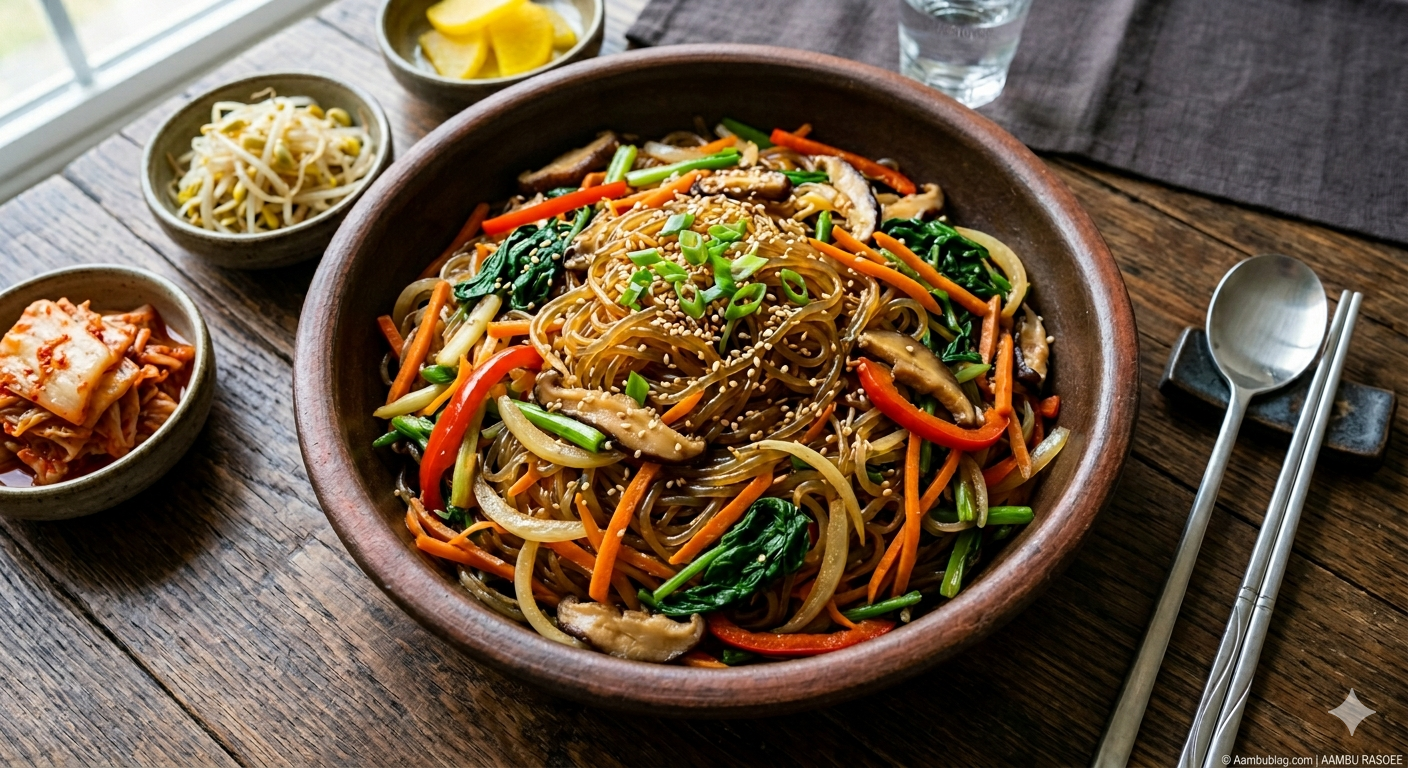 Ans: Authentic Korean Japchae uses noodles made from sweet potato starch. They are called “glass noodles” because they become translucent when cooked. They are naturally gluten-free and very chewy.