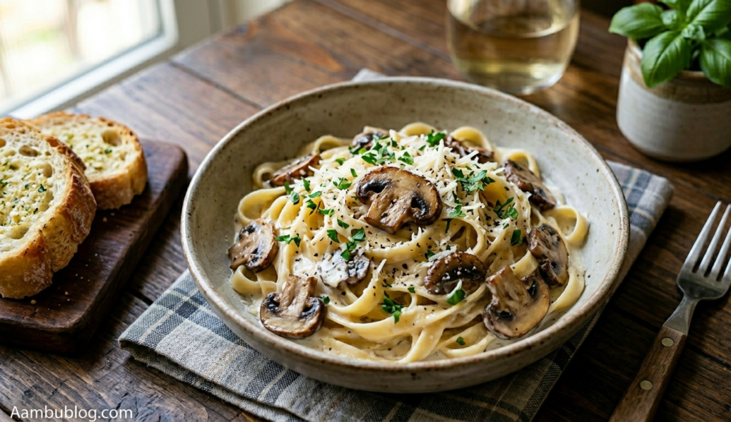This dish features silky pasta tossed in a rich, buttery parmesan cream sauce with earthy sautéed mushrooms. It is the