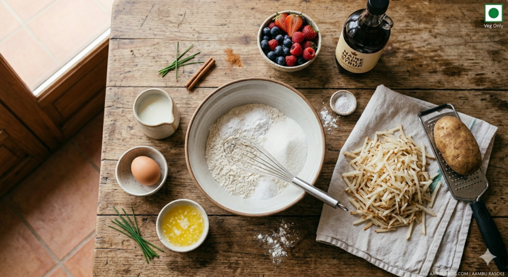 The classic American diner breakfast is a celebration of sweet and savory on a single table. It features tall, incredibly fluffy buttermilk pancakes dripping with pure maple syrup, paired perfectly with golden, crispy shredded hash browns and a flawless sunny-side-up egg. At Aambu Rasoee, we believe the secret to this iconic morning feast is mastering the temperature of your pan and treating each component with the love it deserves.