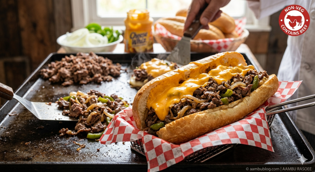 🔴 Non-Veg / Contains Beef & Dairy | 🥘 Main Course / American Cuisine The Authentic Philly Cheesesteak is a