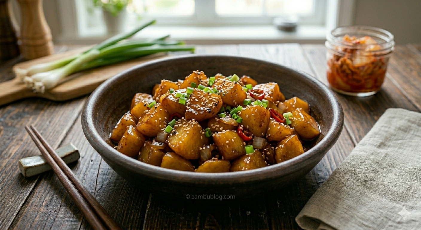 Gamja Jorim is a beloved Korean side dish made by simmering potatoes in a sweet and savory soy-based sauce. The potatoes become incredibly soft and tender, while the sauce glazes them into a beautiful dark amber color. It’s perfect as a side for steamed rice and a great way to turn simple potatoes into an exotic Korean delight!
